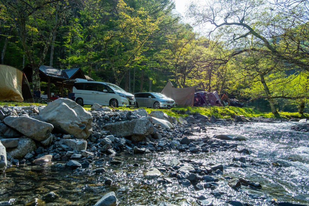 約100㎡の広々区画で、キャンプ初心者やファミリーキャンプにぴったり!すぐ横には綺麗な川が流れ、夜には満点の星空を拝めます。