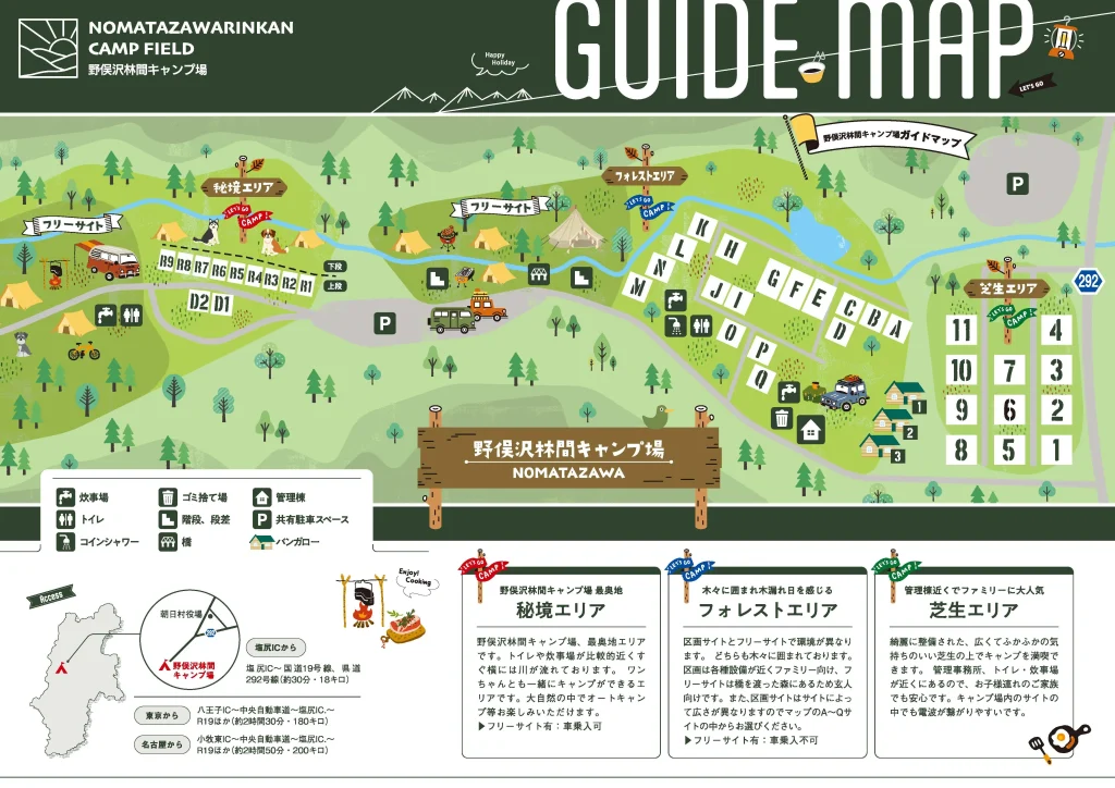 さまざまな環境がキャンプ場内に。自身のキャンプスタイルに最適な場所を見つけてください。初めてのキャンプでも安心なエリアから普通のキャンプ場では満足できない玄人向けのエリアまで幅広く対応しております。
