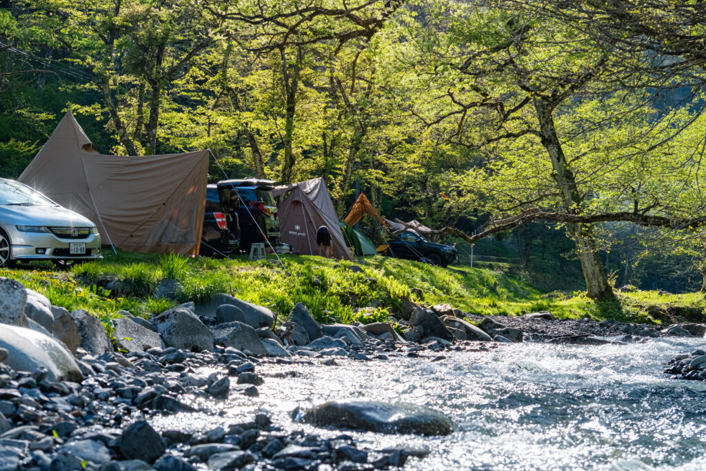 野俣沢林間キャンプ場、最奥地エリアです。トイレや炊事場が比較的近くすぐ横には小川が流れております。 ワンちゃんとも一緒にキャンプができるエリアです。大自然の中でオートキャンプ等お楽しみいただけます。