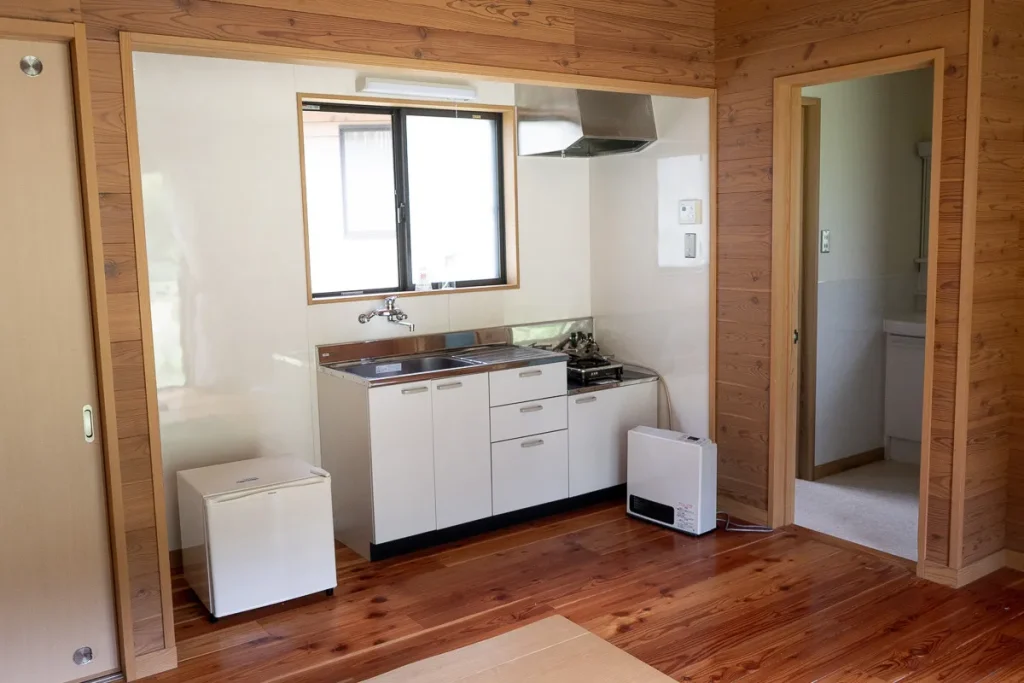 初めての方でも気軽にキャンプを楽しめる、10畳のお部屋でご家族や学生にぴったり! 大きな窓があるため、室内からでも自然を感じることができます。BBQスペース、トイレ、シャワー、洗面台、キッチン、冷蔵庫あり。