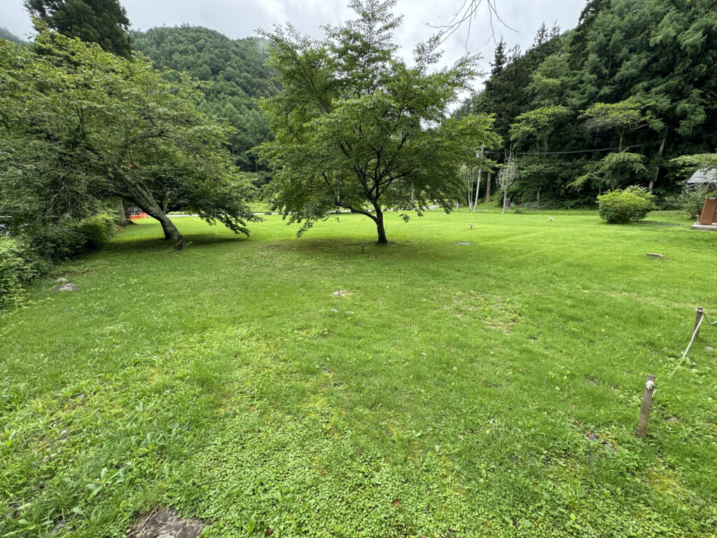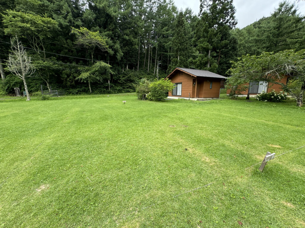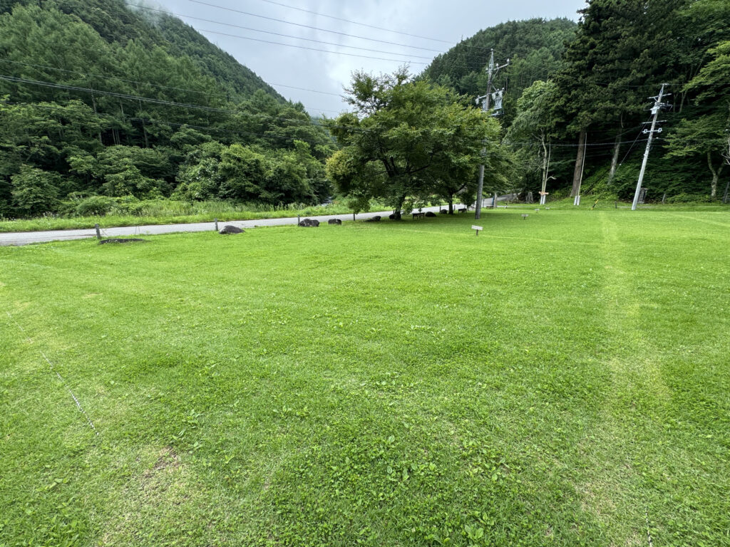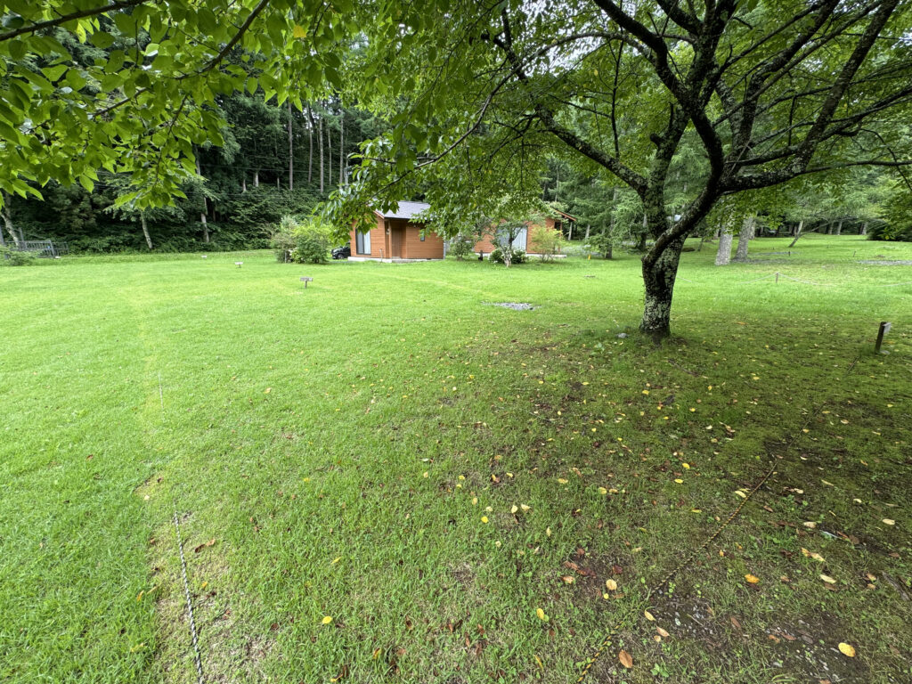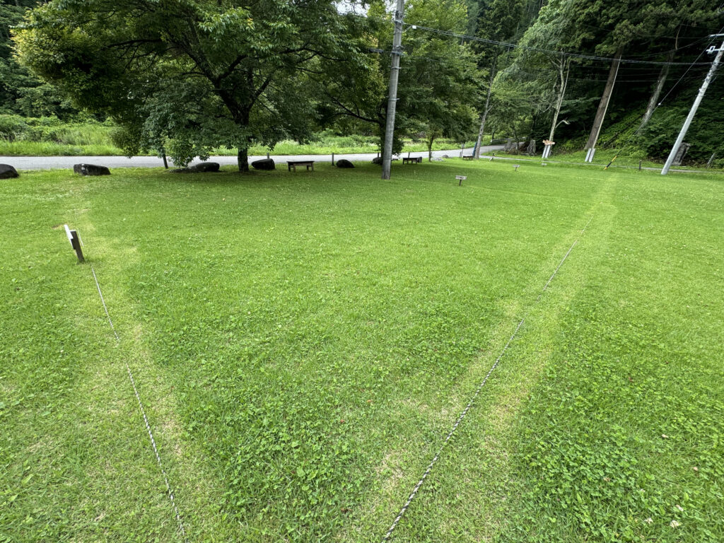 綺麗に整備された、広くてふかふかの気持ちのいい芝生の上でキャンプを満喫できます。管理事務所、トイレ・炊事場が近くにあるので、お子様連れのご家族でも安心です。キャンプ場内のサイトの中でも電波がつながりやすいです。